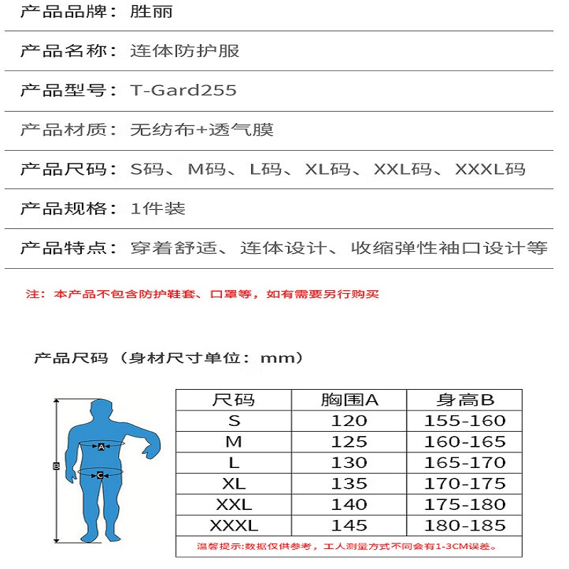 胜丽 T-Gard® D级防护服无尘防尘服连体连帽一次性防护衣防粉尘防水养殖场喷漆工作服 T-Gard 255 1件