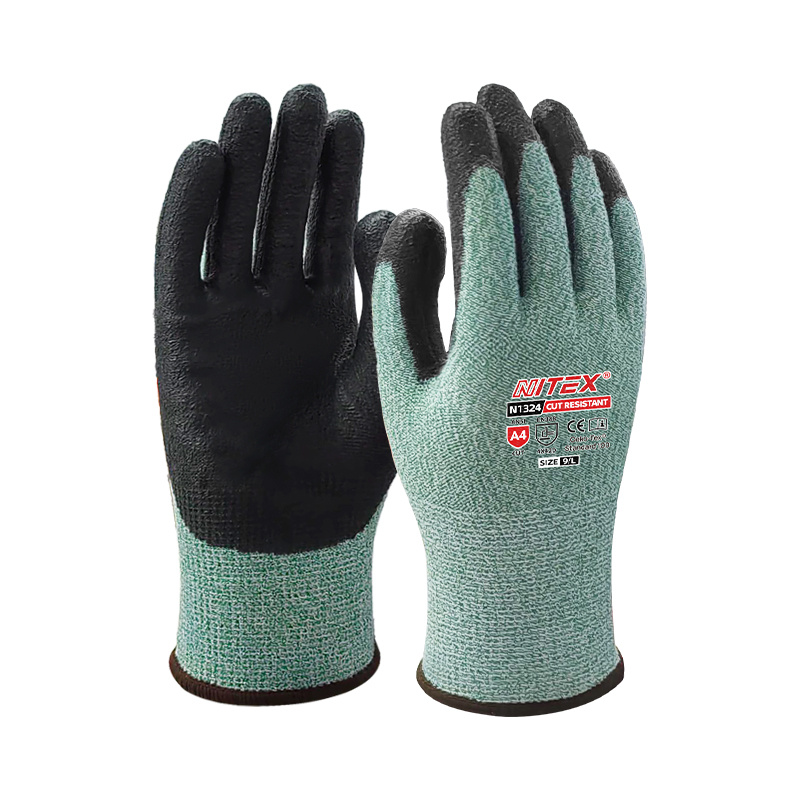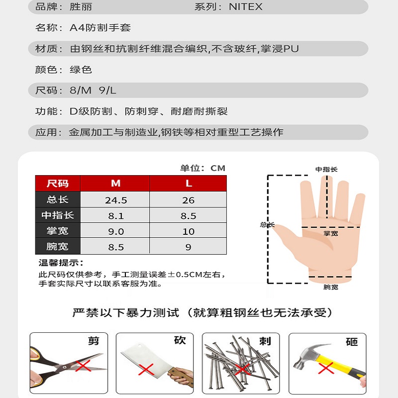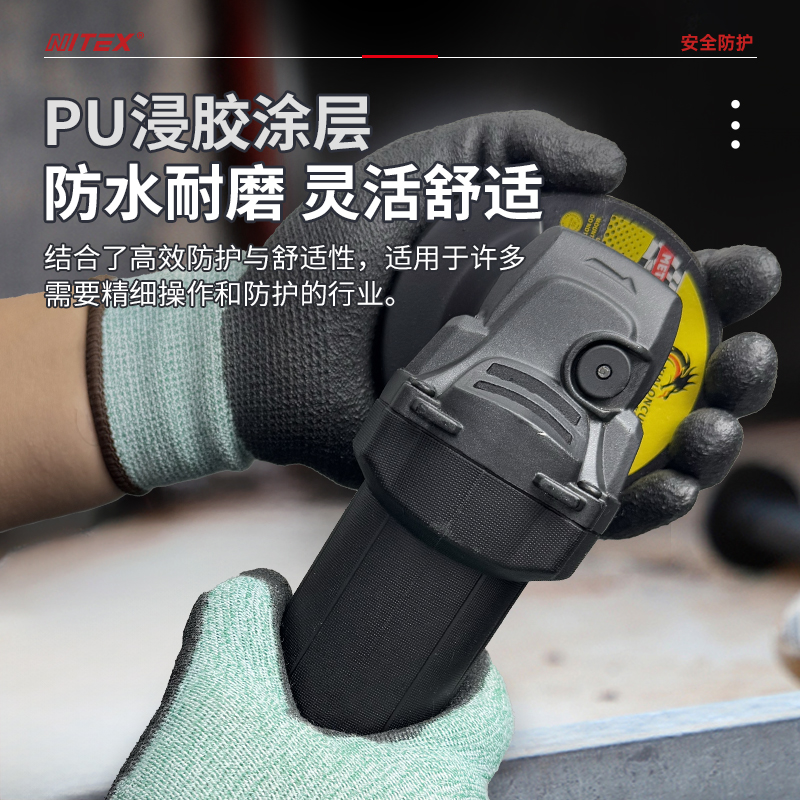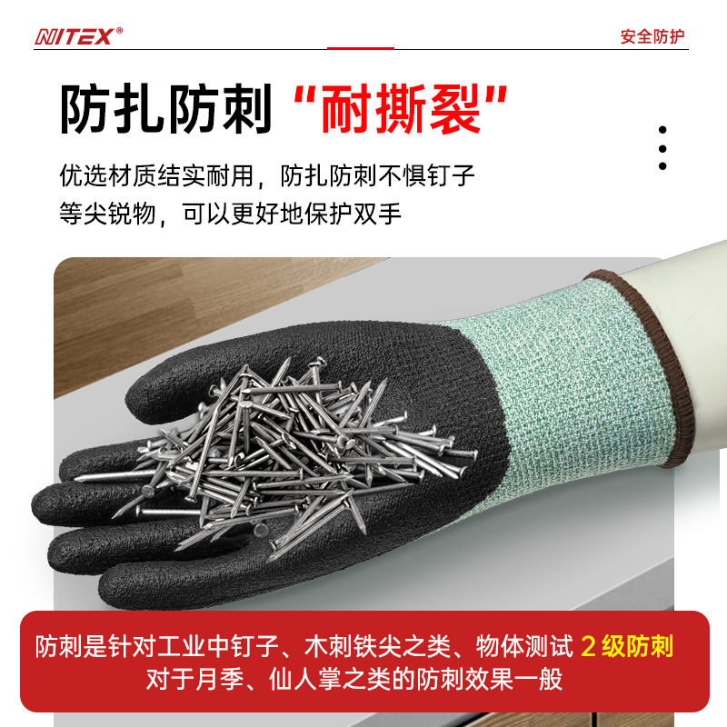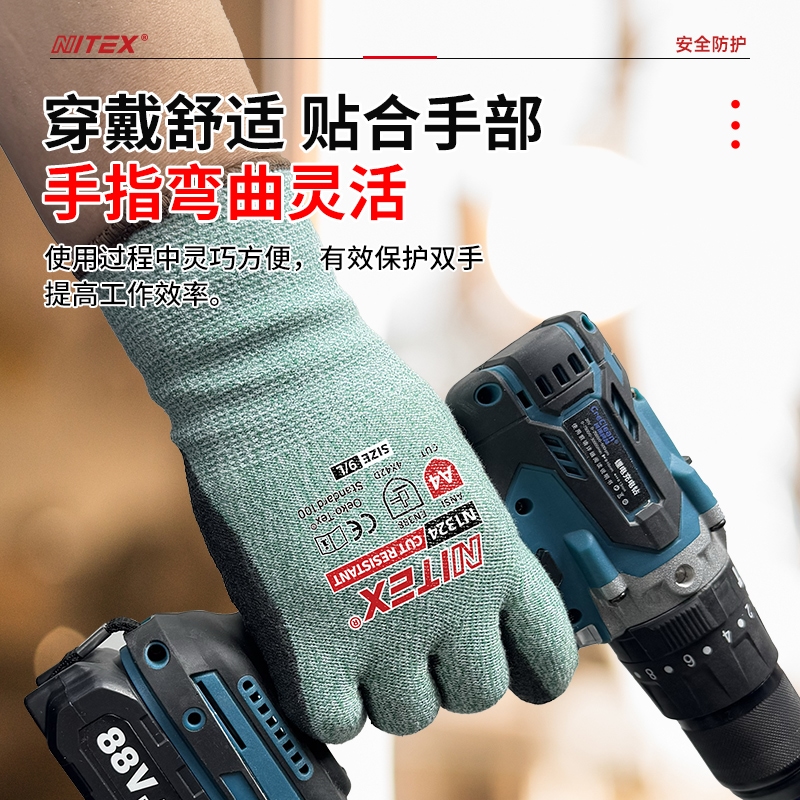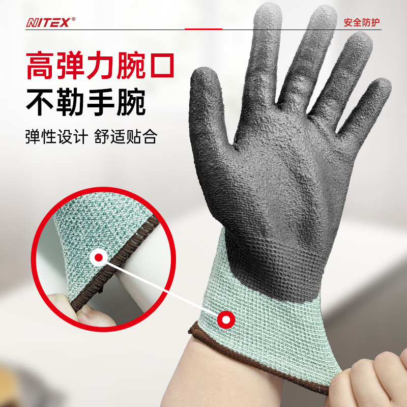 胜丽 NITEX® D级防割手套PU钢丝灵巧耐磨手套 A4防切割防割伤木工手套不含玻纤绿色 N1324