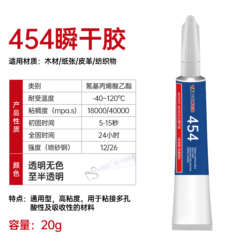 威卡固/VIKAGU 454 强力快干胶软磁铁铁氧体漆包线高粘度高耐温通用型瞬干胶无色透明凝胶 20g 1支