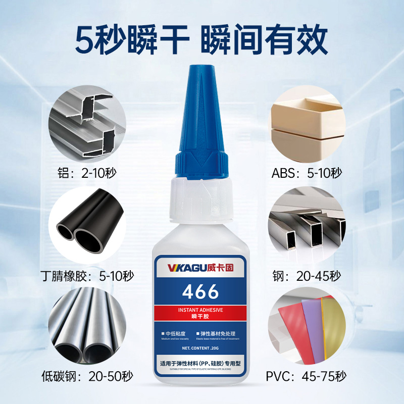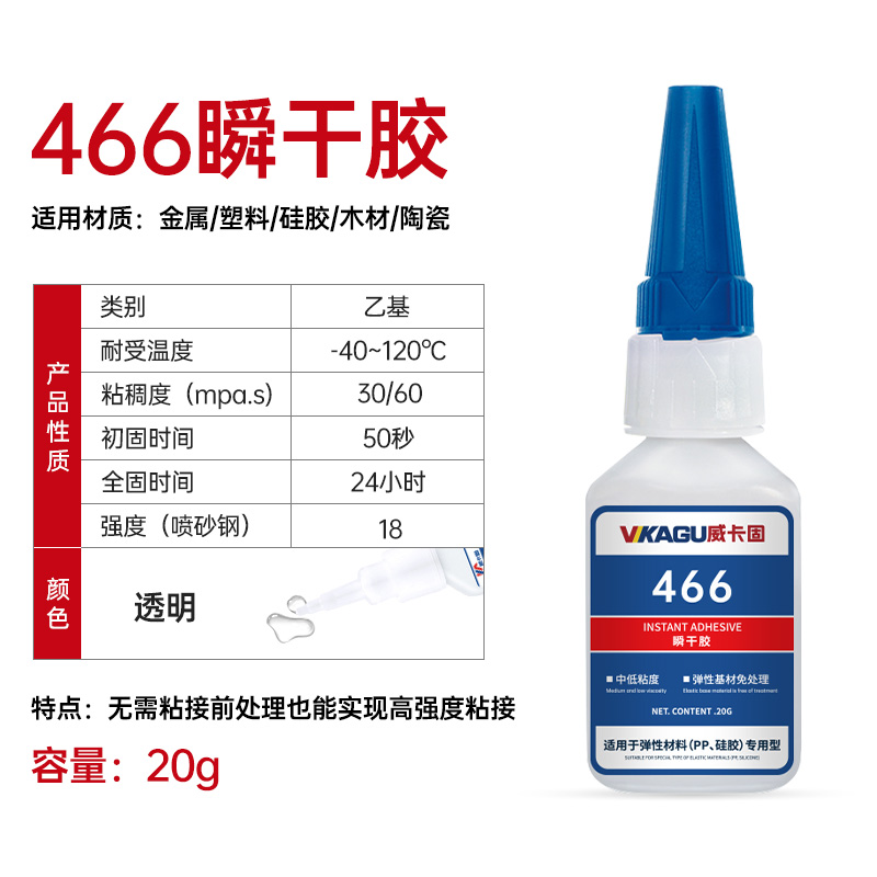 威卡固/VIKAGU 466 瞬干胶低粘度pp硅胶快速固化弹性材料胶水 20g