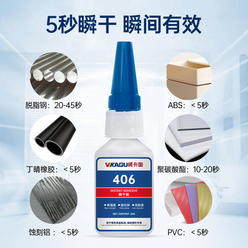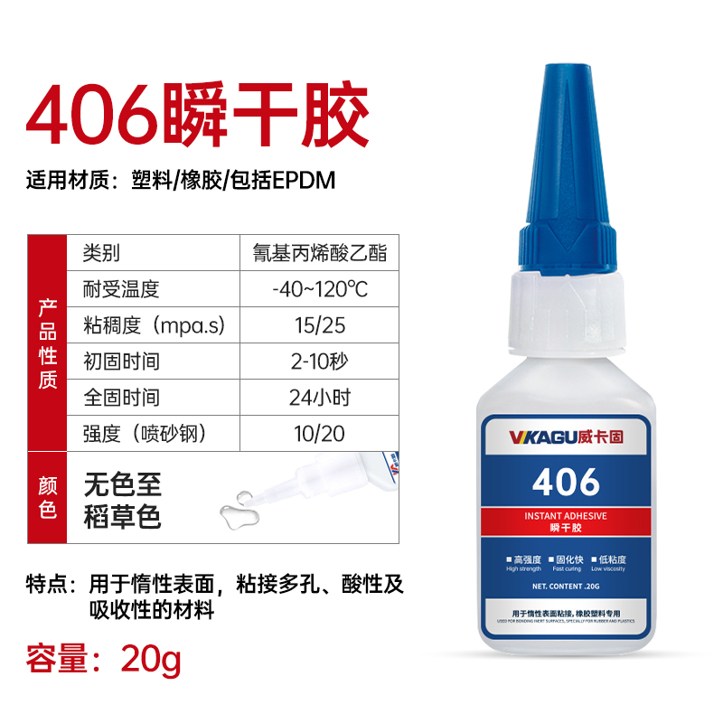 威卡固/VIKAGU 406 强力快干胶 橡胶EPDM快速固化瞬干塑料金属弹性材料胶水 20g 1支