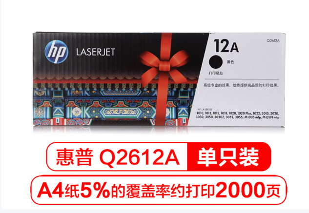 惠普(HP)Q2612A 原装黑色硒鼓 适用机型:hp1010 hp1020 1018 M1005 M1319 约2000页 一支装(定点采购)