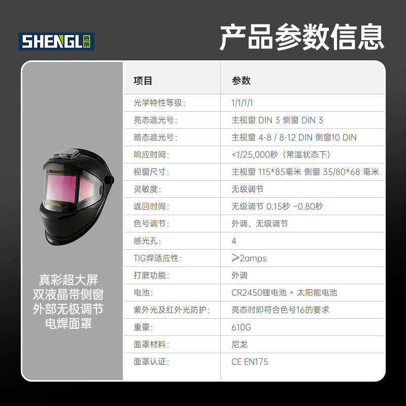 胜丽 专业自动变光电焊面罩180度全景视窗1/1/1/1 光学级高清镜片WHA100