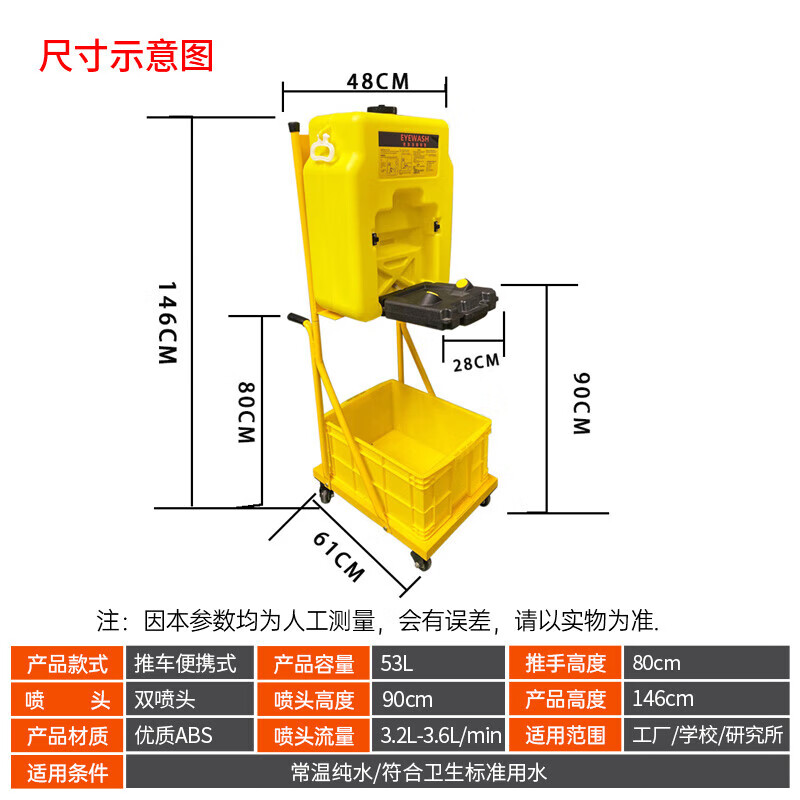胜丽洗眼器便携式验厂双喷头移动式实验室用推车式 53L黄色1套装 EYD53