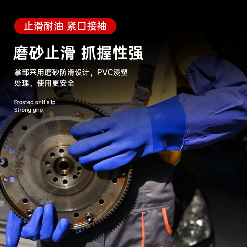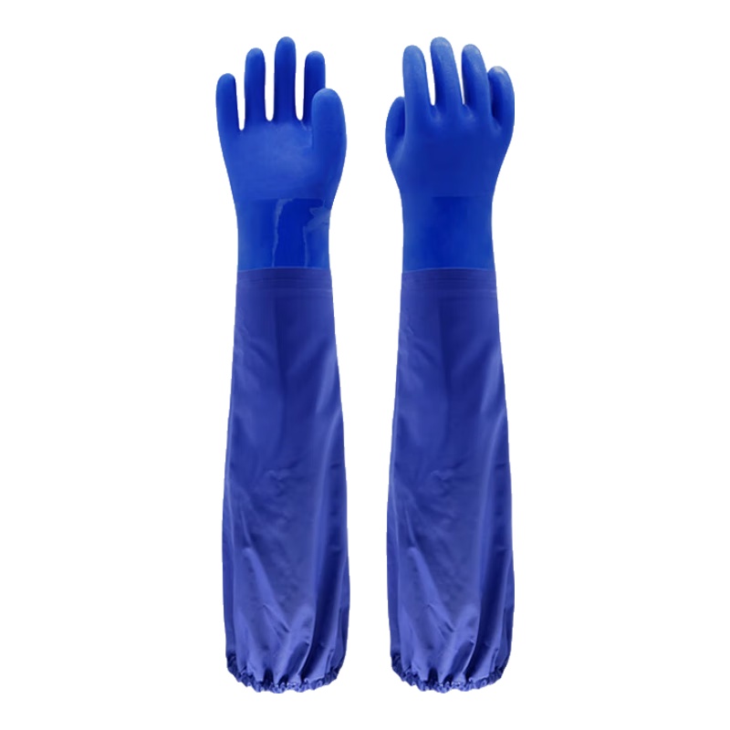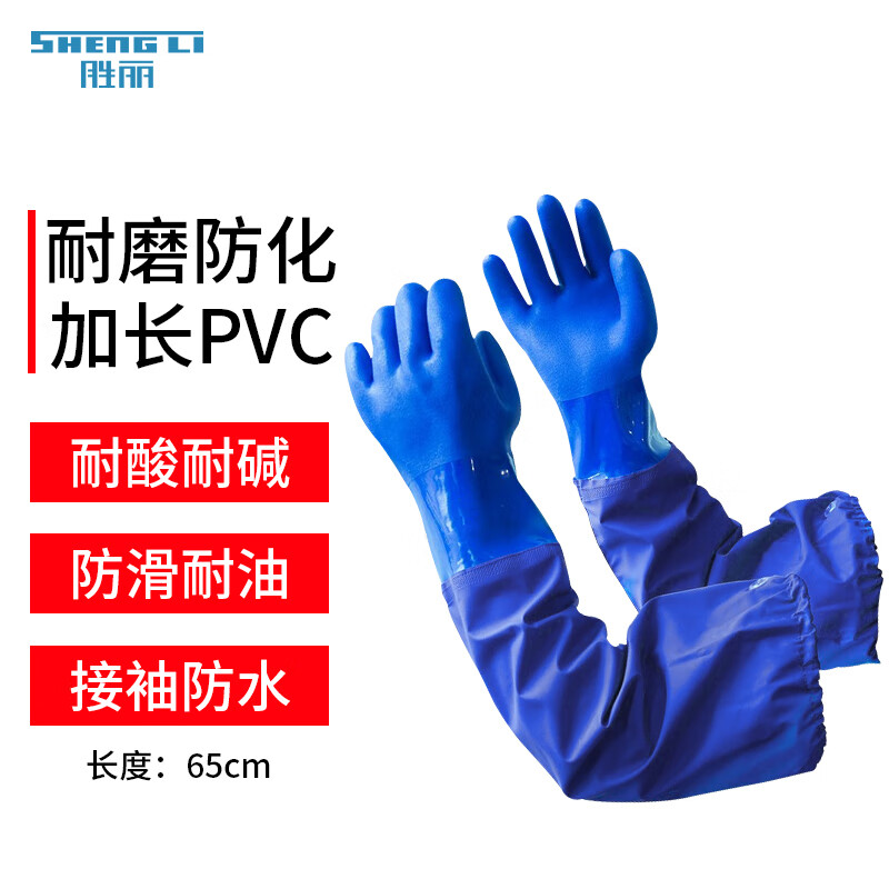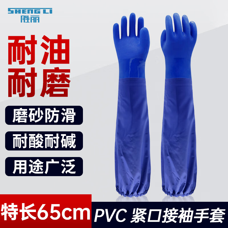 胜丽 手套劳保耐酸碱PVC防水防滑紧口接袖65cm加长蓝色 1副 GFH997-65JB