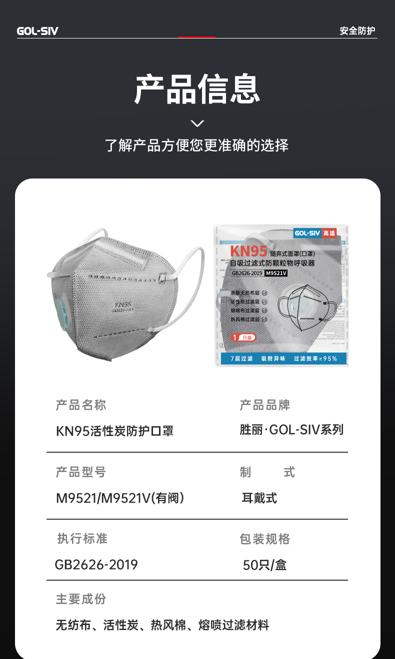 胜丽 M9521V口罩耳带活性炭KN95带呼吸阀 50只/盒