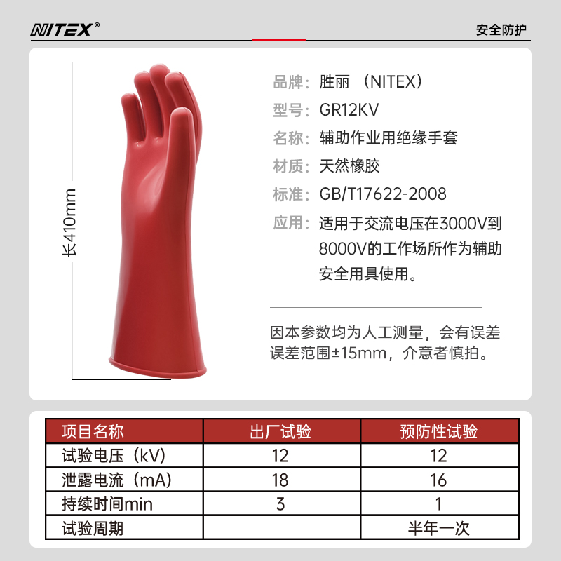 胜丽 NITEX® 12KV高压绝缘手套电工带电作业GB/T 17622-2008高压1.2级手掌型 GR12KV 1双