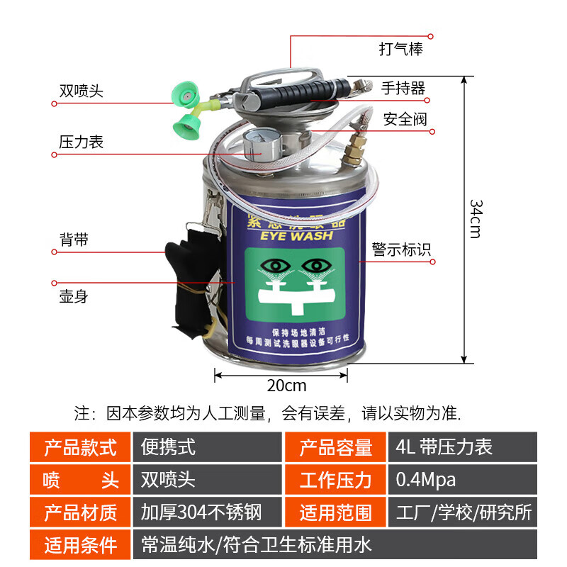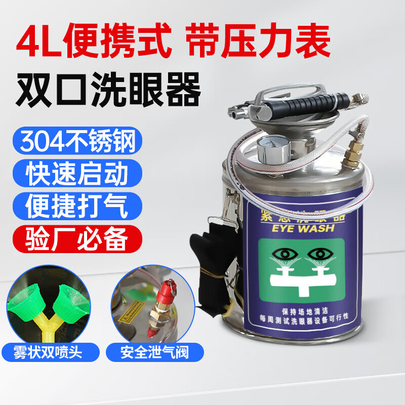胜丽便携洗眼器验厂工业实验室双口可移动压力表304不锈钢4L1台装 EY3044