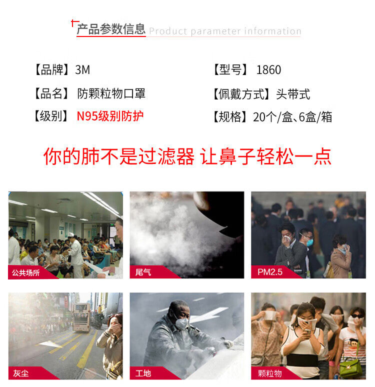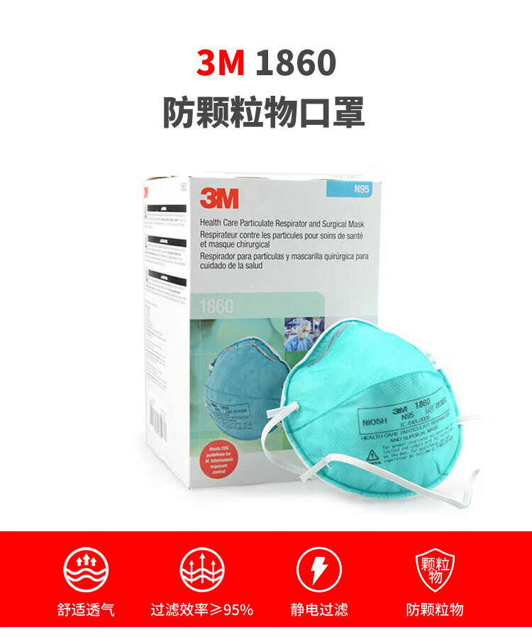 3M 1860口罩 N95防护口罩 防飞沫防雾霾防粉尘PM2.5防飞沫 20只/盒