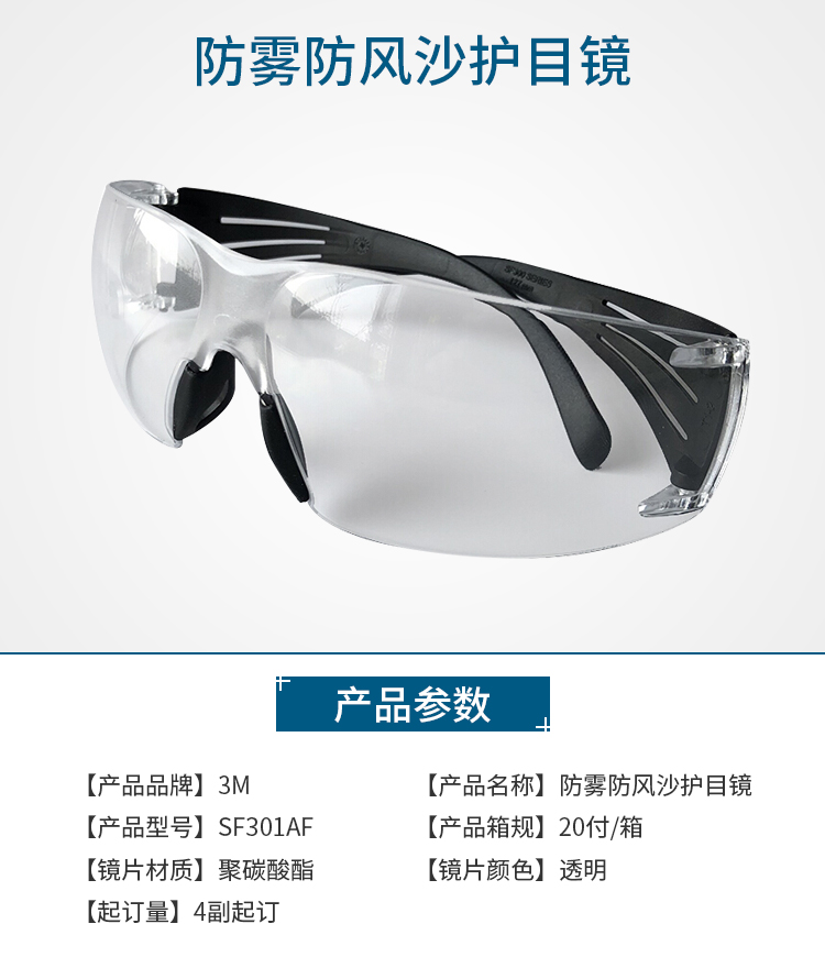 3M SF301AF 护目镜 中国款安全眼镜 防雾防风沙护目镜 透明 1副装