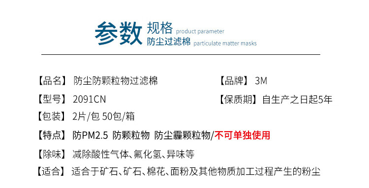 3M 防尘面具配件 2091CN滤棉 可过滤各类颗粒物电焊烟等 2片装