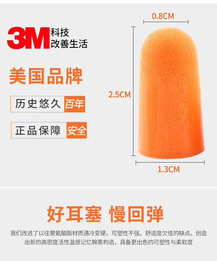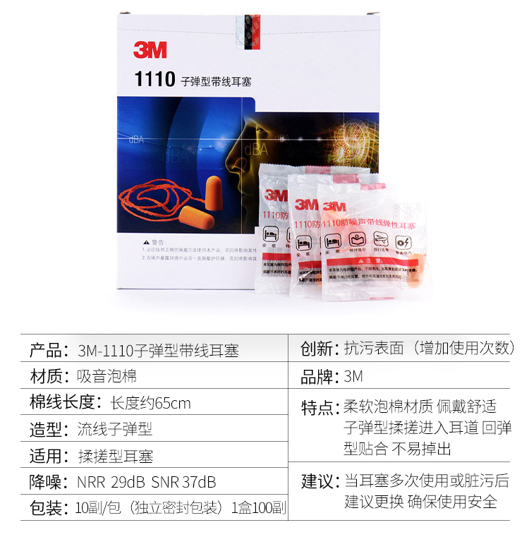 3M 1110带线耳塞 抗噪 防噪音耳塞 睡眠静音耳塞 睡觉工作学习入耳式耳塞 20副装