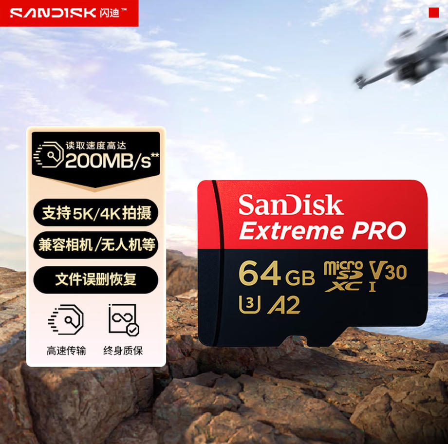 森淼办公 闪迪(SanDisk)64GB TF(MicroSD)存储卡 U3 C10 A2 V30 4K 至尊超极速移动版内存卡 读速200MB/s