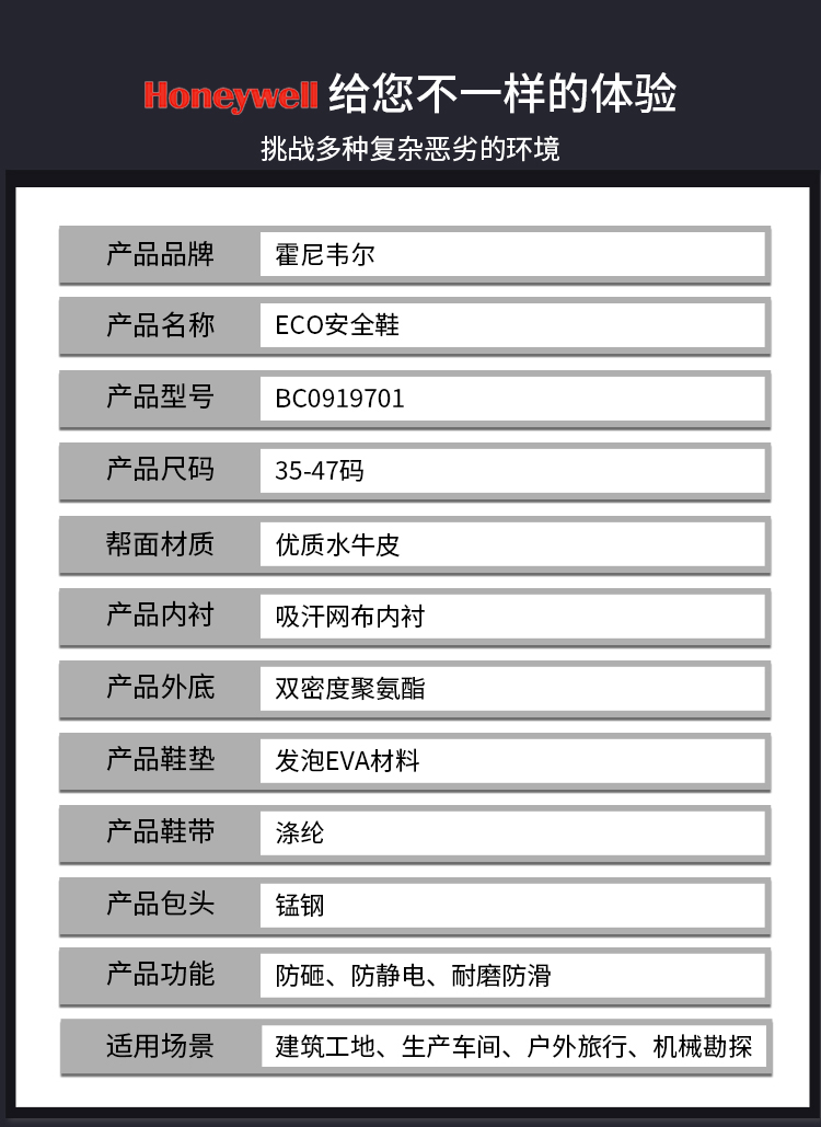 霍尼韦尔 BC0919701 劳保鞋 巴固ECO安全鞋 防砸防静电