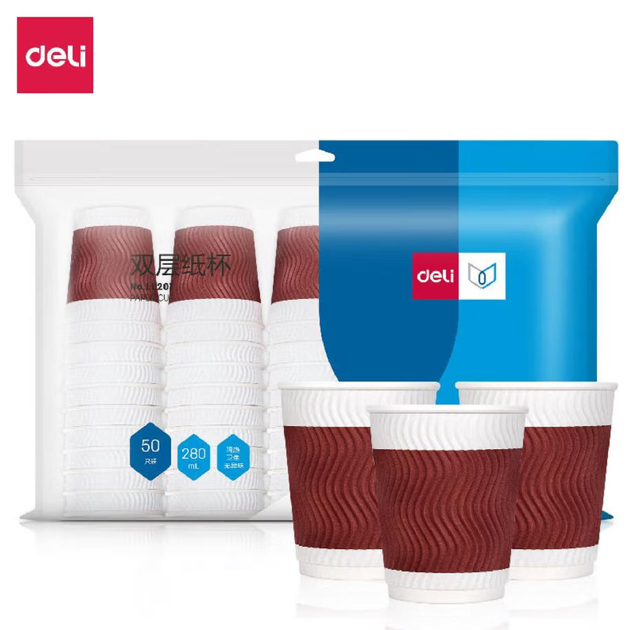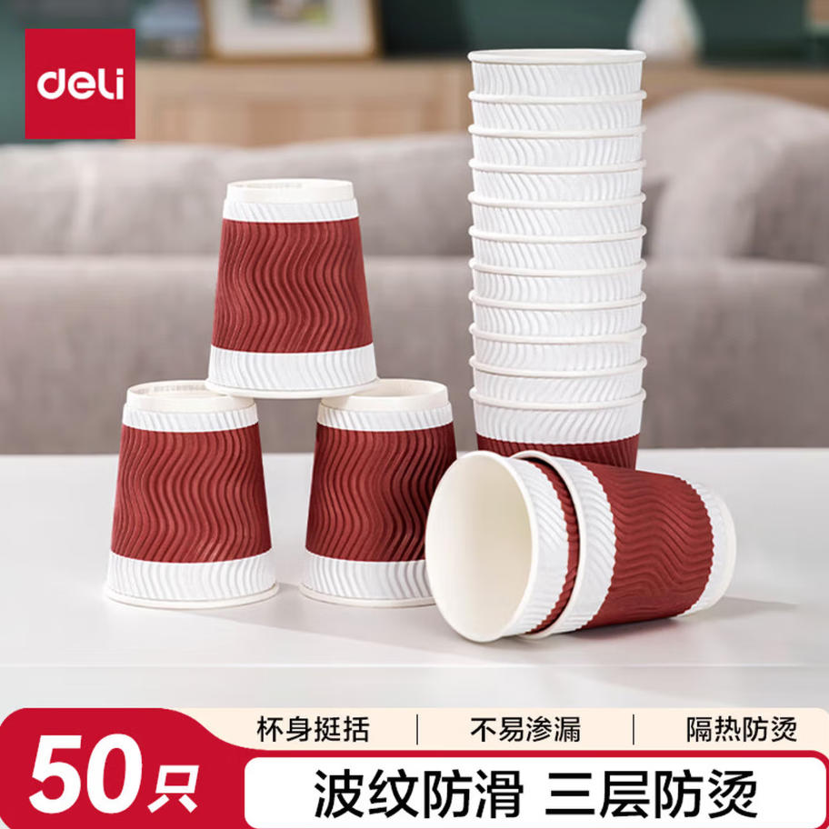 森淼办公 得力(deli)280ml一次性纸杯 杯子/水杯 三层 加厚 隔热 波纹 红色 绿色 随机发货 50只装 LL201