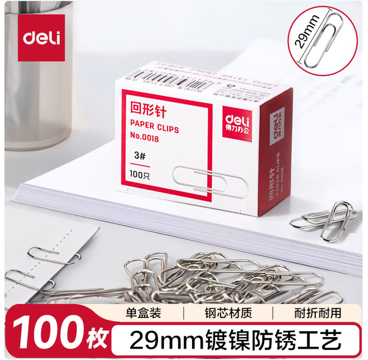 得力(deli)3#金属回形针 镀镍防锈曲别针 办公室具用品 0018 100枚/盒 10盒/组
