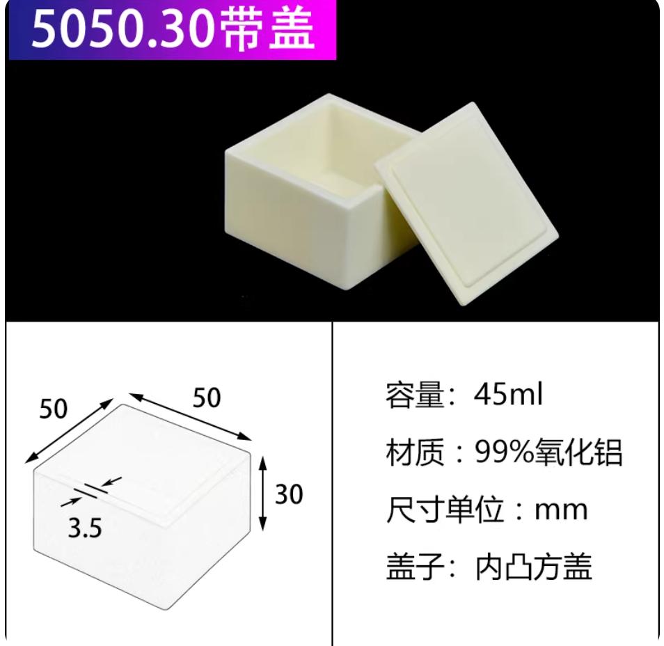 刚玉坩埚99%氧化铝方舟带盖子方形船舟长方灰皿管式炉瓷舟50*50*30mm带内凸盖45ml