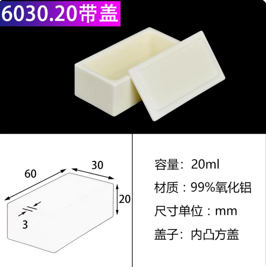 刚玉坩埚99%氧化铝方舟带盖子方形船舟长方灰皿管式炉瓷舟60*30*20mm带内凸盖20ml