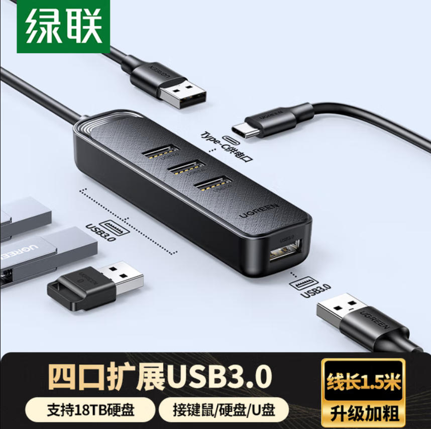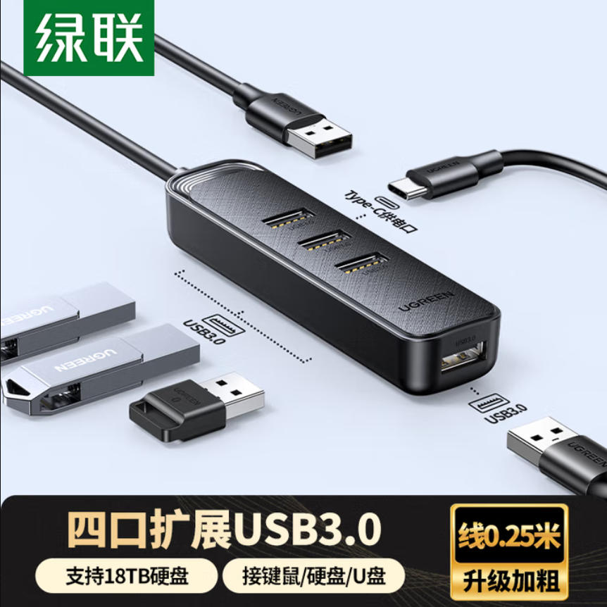 君航科技 绿联 USB扩展器3.0扩展坞多接口分线器 一分四 HUB集线器高速4口拓展坞 笔记本电脑转接头 延长线 转换器线 0.25米 1米 1.5米
