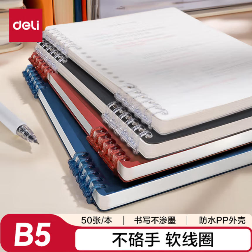 君航科技 得力(deli)B5不硌手 活页本 线圈本 笔记本 本子 透明 红色 深蓝 横线 可开合 作业本 HB550
