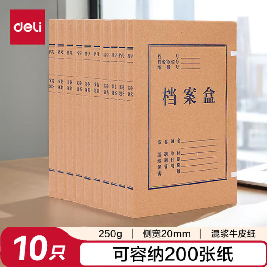 君航科技 得力(deli)10只20mm混浆250g牛皮纸文件盒 档案盒 财务收纳盒 学生考试收纳 63201
