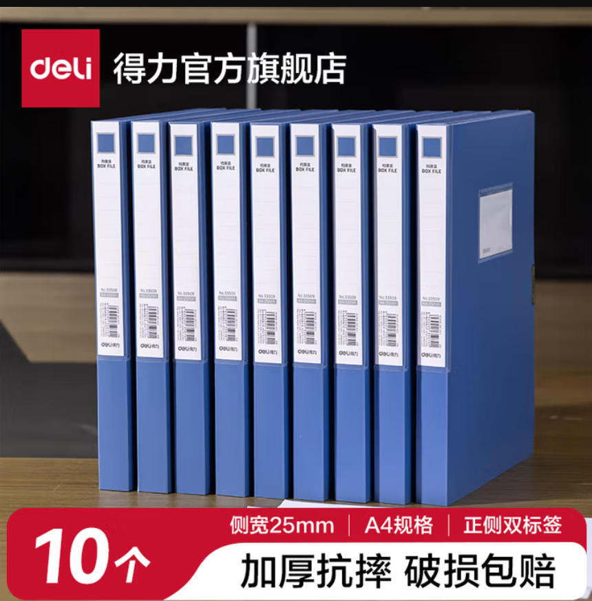 君航科技 得力(deli)【10只装】A4粘扣档案盒塑料文件盒塑料加厚资料盒文件收纳盒财务凭证整理办公用品 背宽25mm 约装250张