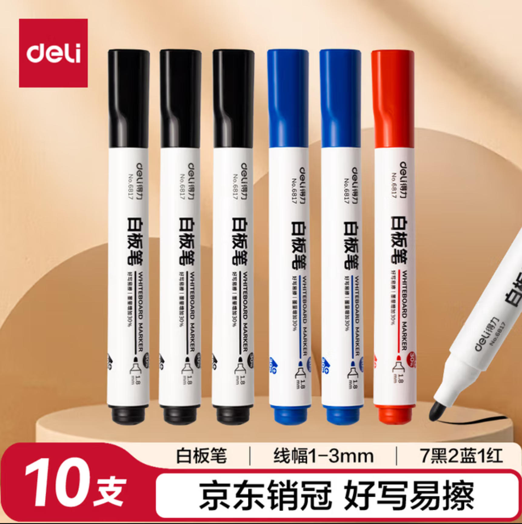 君航科技 得力(deli) 白板笔套装 可擦易擦书写顺滑 办公文具会议教学 7黑2蓝1红混色 10支/盒 33176