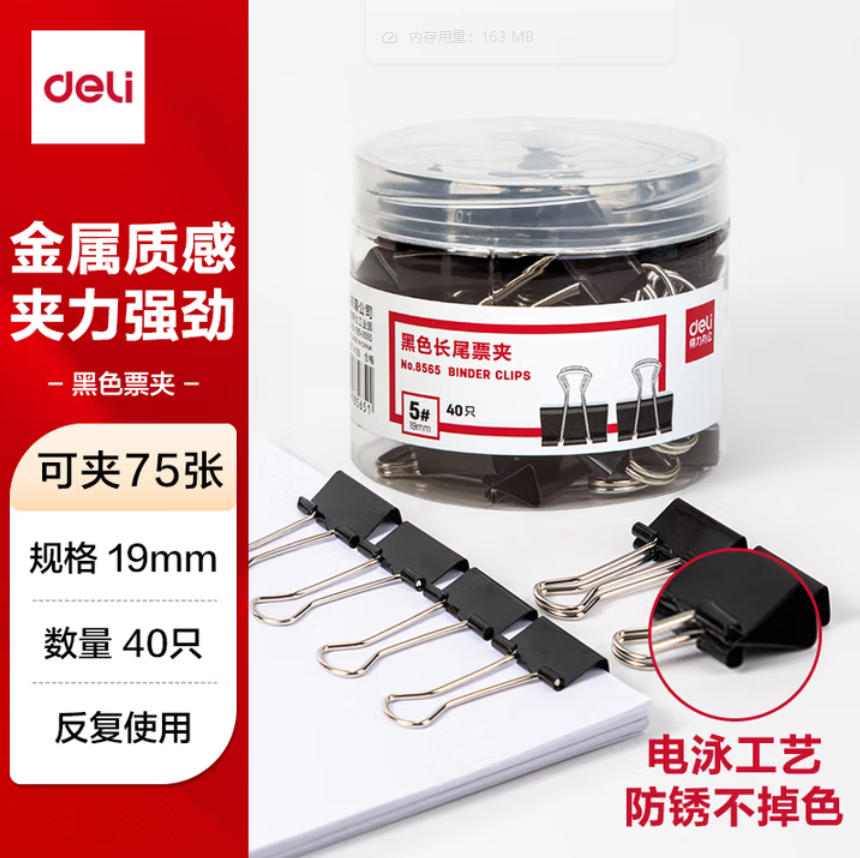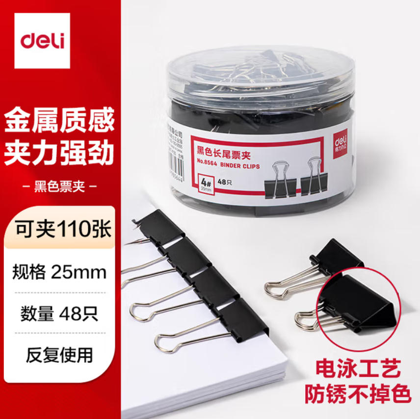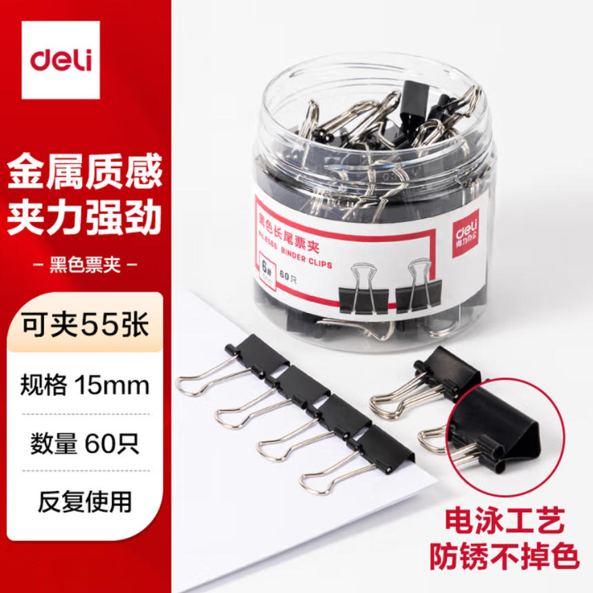 君航科技 得力(deli)【超级爆款】60只15mm 19mm 25mm 32mm 41mm 50mm黑色长尾夹票夹 小号金属燕尾夹票据文件夹办公 60只/筒 8566